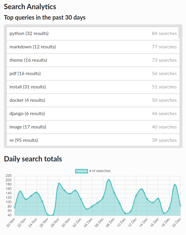 When someone visits your documentation and uses the built-in server side search feature, Read the Docs will collect analytics on their search queries.